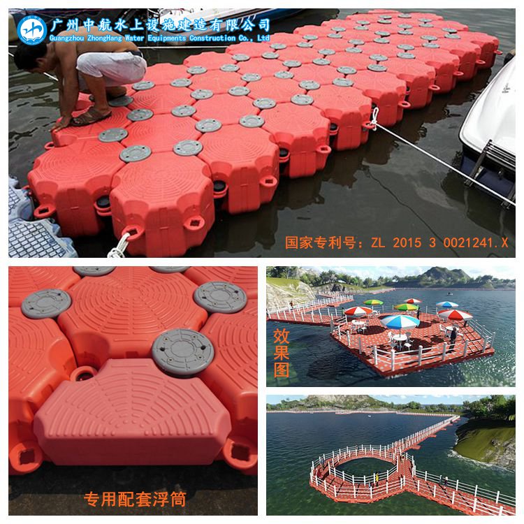 廣東中航公司結合現有四方形浮筒研發技術,經過研發及技術團隊總結了解對水上浮筒設計經驗以及日新月異的客戶需求,研發出新型蜂巢式六邊浮筒及配套浮筒(具備防撞及補邊功能),相比起四邊浮筒,蜂巢式六邊浮筒在風浪較大的環境下更加平穩,并且可以根據客戶的需求,組裝成不同的形狀。